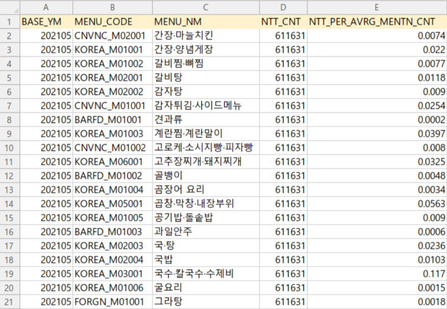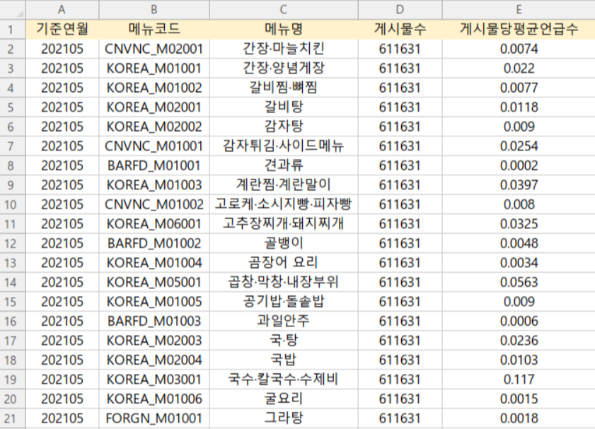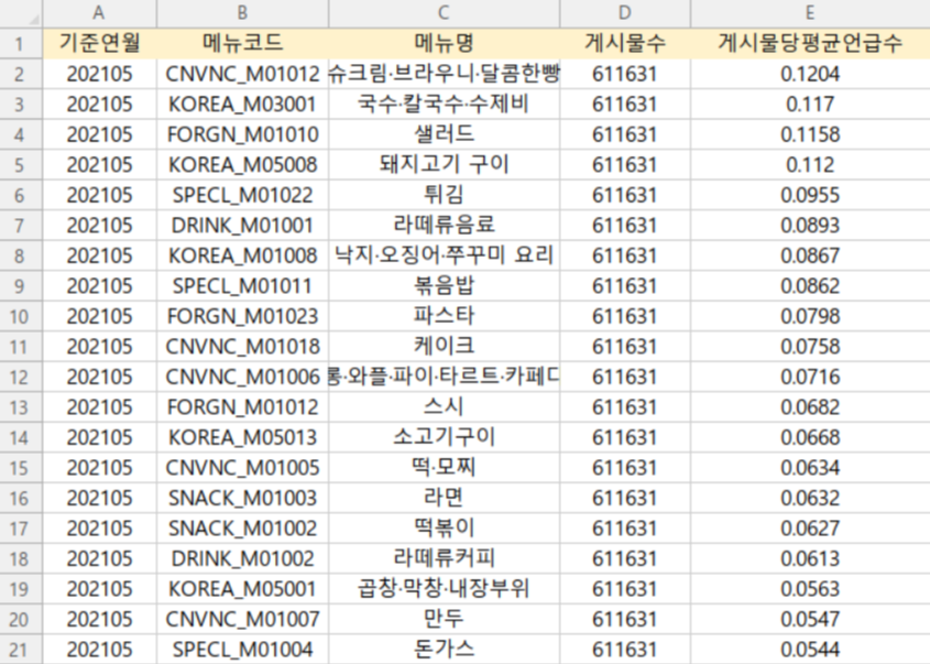 - 칼럼 : 기준연월, 메뉴코드, 메뉴명, 게시물수, 게시물당평균언급수
