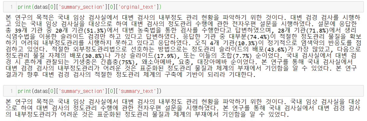 출력된 결과를 보면, 논문id, 논문제목, 날짜, 분야, 발행기관, 저자에 대해 알 수 있습니다. 반면 마지막 네 줄에 summary_entire는 논문 초록(abstract)의 원문, summary_text는 논문 초록의 요약, summary_section은 섹션 원문, summary_text는 섹션 요약문을 나타낸답니다.
