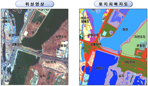 토지 피복지도란 아래와 같이 특정한 지리 특성만을 선택적으로 표현한 지도(주제도)로, 지구표면 지형지물의 형태를 일정한 과학적 기준에 따라 분류해 동질의 특성을 지닌 구역을 같은 색으로 나타낸 지도를 말합니다.