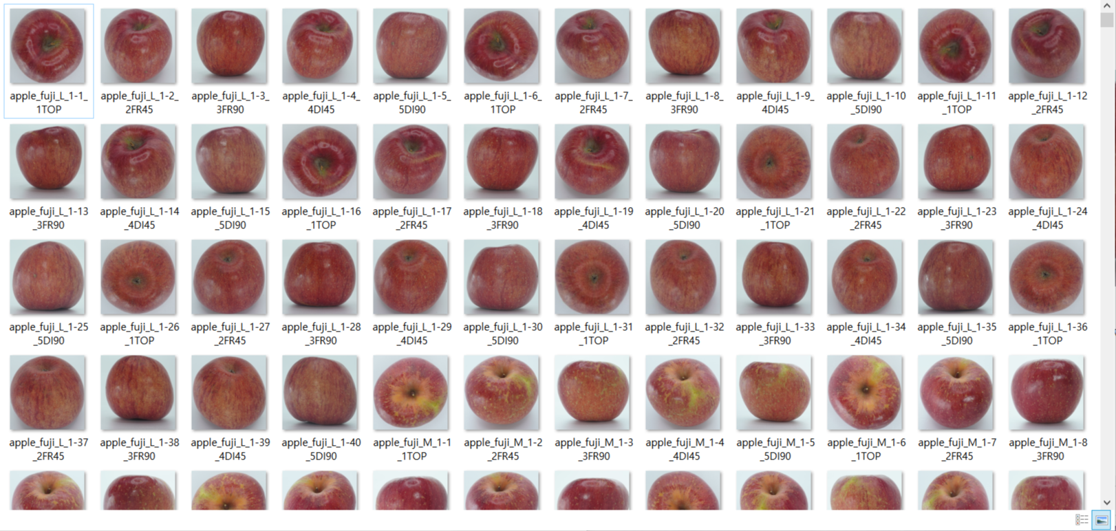 위 이미지를 살펴보면 동일한 사과에 대해 다양한 각도로 촬영이 된 것을 살펴볼 수 있는데요, 위 3개의 이미지 말고도 아래와 같이 동일한 품목에 대해 여러 이미지(약 150~200개)로 구축되어 있습니다.