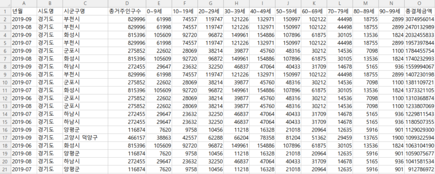 위 데이터를 보면 년월, 시도명, 시군구명, 총 거주 인구수 칼럼이 있고, 연령별 사용빈도수, 총 결제금액 칼럼이 있는 것을 확인할 수 있습니다. 여기서 총 결제금액은 시군구 행정동 별 결제금액인데요, 위 이미지 상에 나와 있는 데이터는 3월에 취득된 데이터로 총 결제금액이 0으로 되어있는 것으로 보아 3월에는 데이터가 구축되지 못한 것 같네요~ 그럼 9월에 총 결제금액이 나와있는 데이터를 살펴볼까요~?