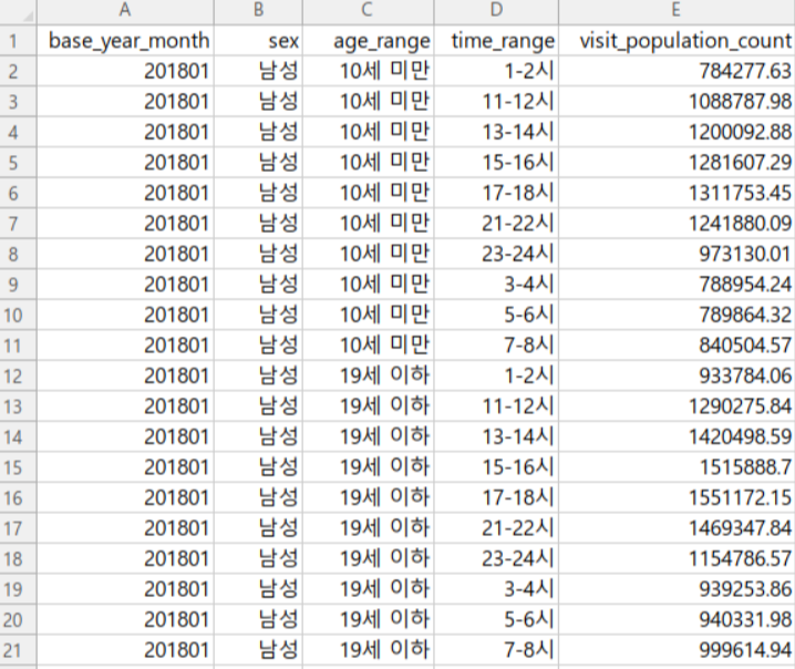 따라서 칼럼 이름이 있는 첫 번째 행 밑에 있는 두 번째 행 데이터를 살펴보면, 해당 데이터는 2018년 1월 1-2시에 측정된 10세 미만 남성의 방문 인구 수라는 것을 알 수 있습니다.