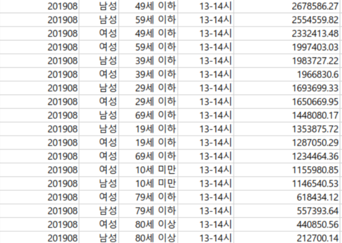 위 데이터는 2019년 8월 오후 1-2시에 유동인구수를 기준으로 정렬한 데이터인데요, 가장 많은 유동인구 수를 차지한 데이터는 40대 남성의 유동인구 수입니다. 그 뒤로 50대 남성, 40대 여성이 뒤를 잇고 있는 것을 확인할 수 있습니다. 코로나가 유행하고 있던 시기라 중장년층보다는 청년층이 다소 유동인구 수가 많을 것이라 예상했었는데요, 예상외로 중장년층의 유동인구 수가 많은 것을 확인할 수 있네요-!