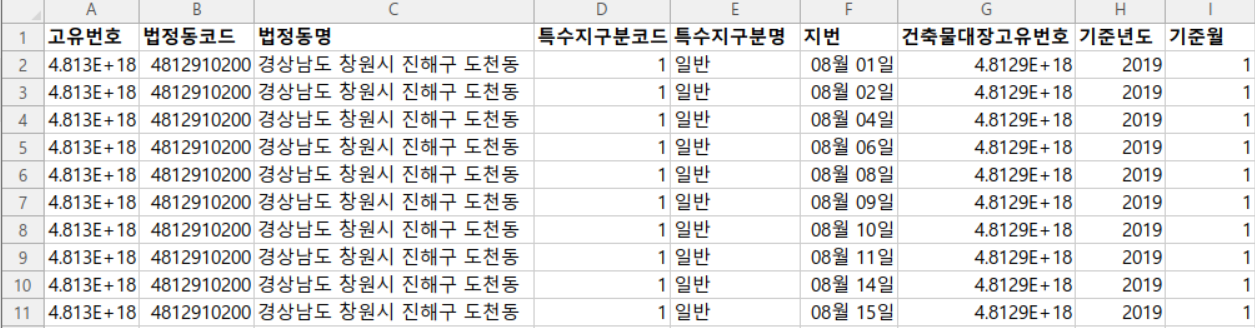 - 데이터 칼럼 : 고유번호, 법정동코드, 법정동명, 특수지구분코드, 특수지구분명, 지번, 건축물대장고유번호, 기준년도, 기준월, 동코드, 동명, 토지대장면적, 산정대지면적, 건물전체연면적, 건물산정연면적, 주택가격, 표준지여부, 데이터기준일자,