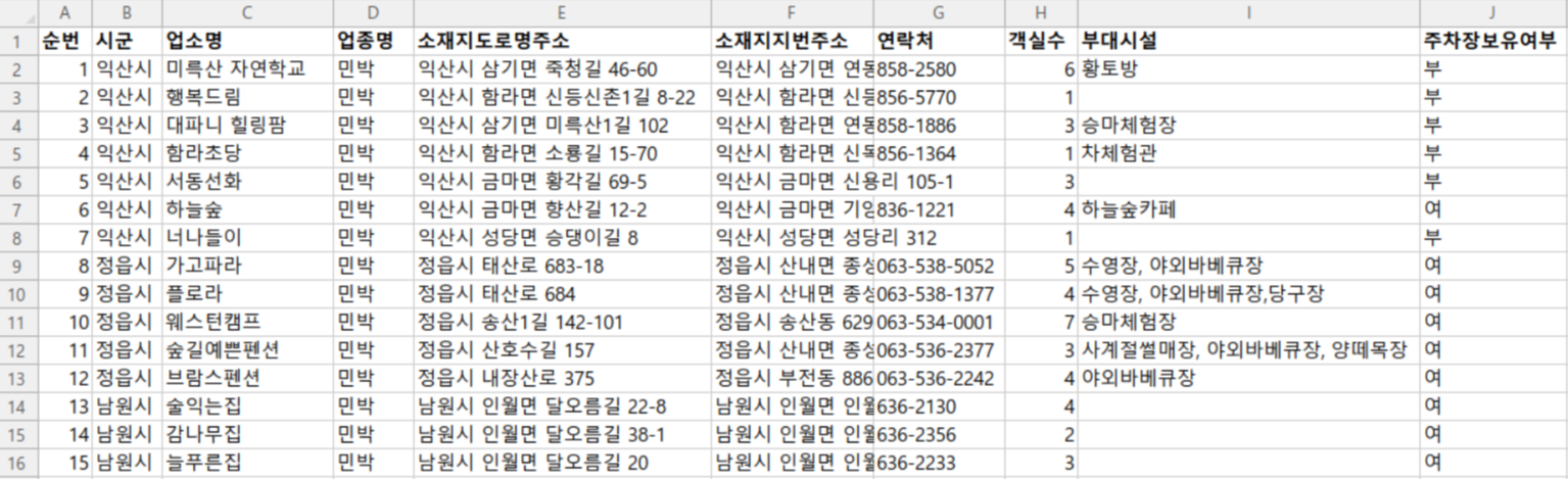 - 데이터 칼럼 : 순번, 시군, 업소명, 업종명, 소재지도로명주소, 소재지지번주소, 연락처 객실수, 부대시설, 주차장보유여부, 결제방법, 홈페이지주소, 주변관광정보, 경도(WGS84좌표), 위도(WGS84좌표), 데이터기준일자