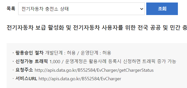 전기차충전소를 검색해 위와같이 환경공단에서 제공하는 API 서비스에 활용신청을 하고,