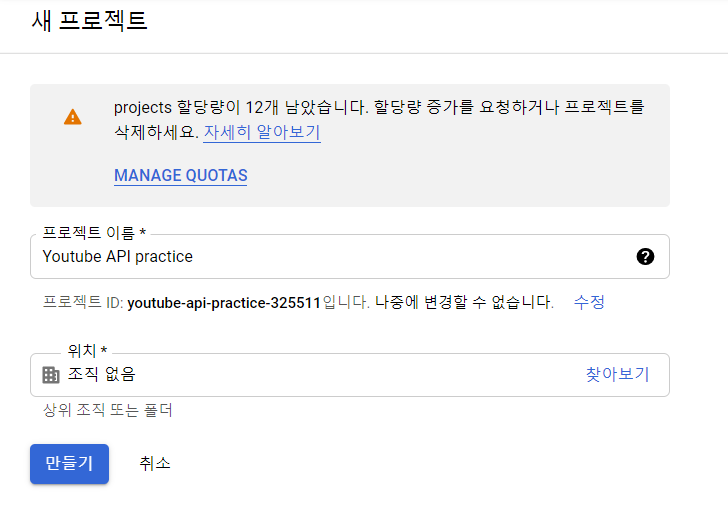 가장 먼저 구글 계정으로 로그인하여 구글 클라우드 플랫폼에서 아래 예시와 같이 새 프로젝트를 생성해주세요!
