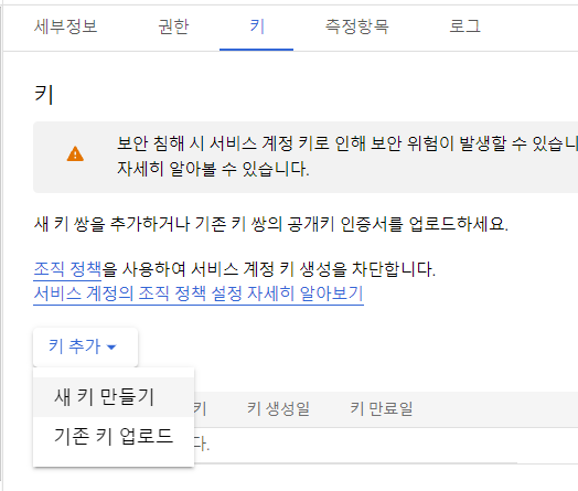 이후 생성된 서비스 계정을 선택하여 키 탭을 클릭한 뒤 키 추가 버튼을 클릭하여 JSON 파일 형태의 key를 다운로드합니다.