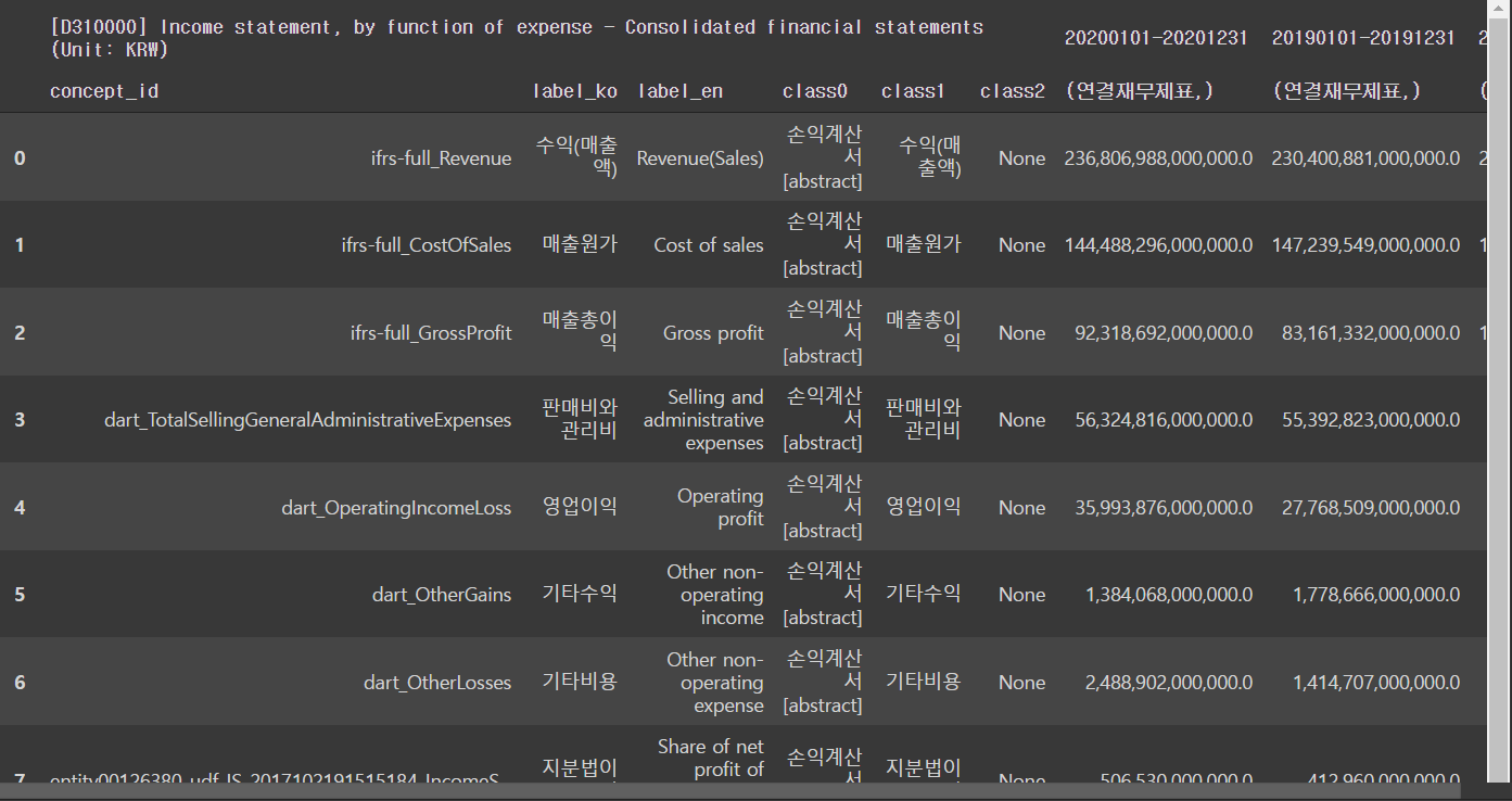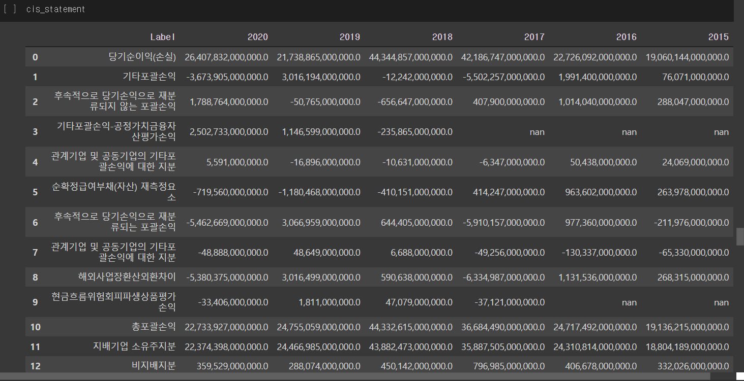 손익계산서, 재무상태표 이외에도 포괄손익계산서, 현금흐름표를 아래 코드를 활용하면 데이터프레임으로 나타낼 수 있습니다.