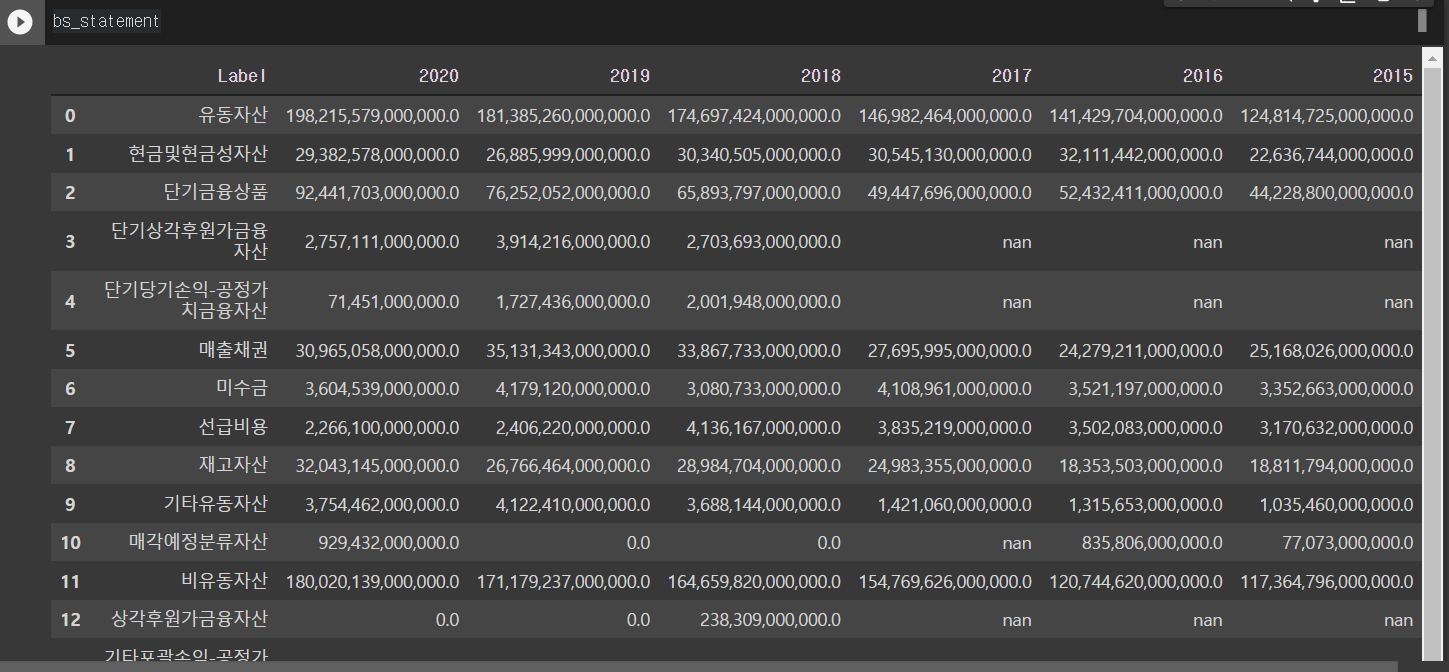 이번에는 위에서 수집한 연간 연결재무제표 중에서 재무상태표(BS)만 데이터프레임으로 가져와보겠습니다.