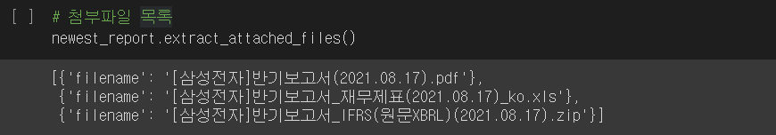 첨부파일 목록을 불러오는 extract_attached_files() 메서드, 첨부보고서 목록을 불러오는 extract_attached_reports() 메서드 등이 있습니다..