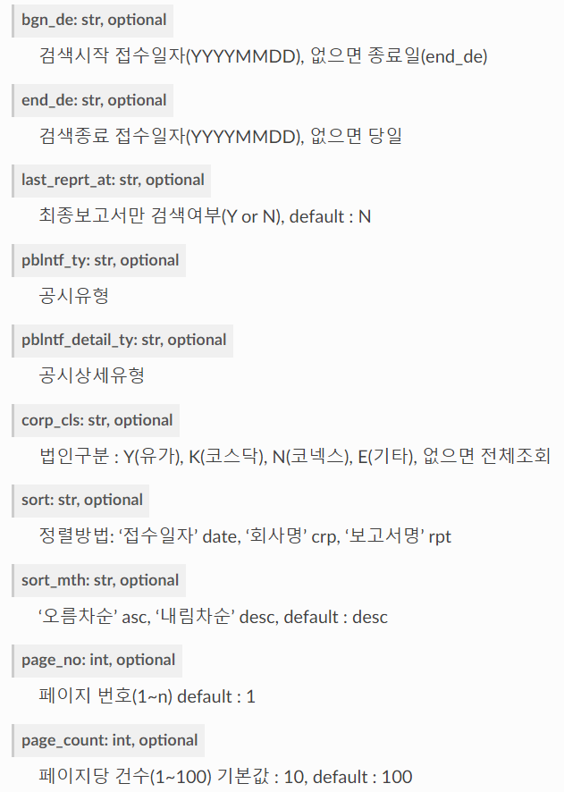 bgn_de(검색 시작일자)를 제외한 모든 parameter는 optional(선택사항)이며 bgn_de 파라미터는 반드시 입력해야합니다.