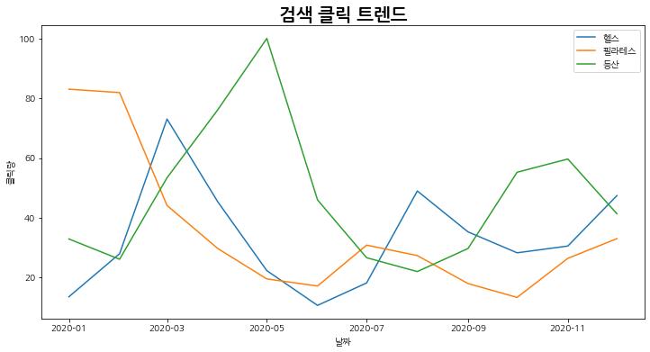 (예제로는 2020년 20~30대의 "헬스", "필라테스", "등산" 에 대한 월별 트렌드를 불러오겠습니다.)