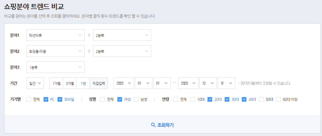 (예제로는 2020년 20~40대 여성의 "패션의류", "화장품/미용" 에 대한 월별 트렌드를 불러오겠습니다.)