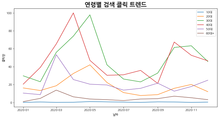 이번에는 키워드별 검색 클릭 트렌드를 연령별(10대,20대,30대,40대,50대,60대 이상)로 조회해보겠습니다.