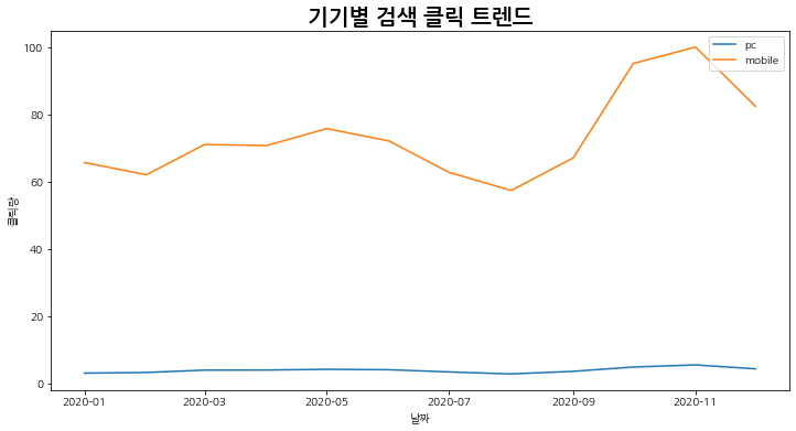 plt.title('기기별 검색 클릭 트렌드', size=20, weight='bold')