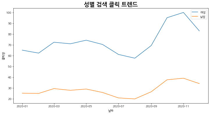 이번에는 키워드별 검색 클릭 트렌드를 성별(여성, 남성)로 조회해보겠습니다.