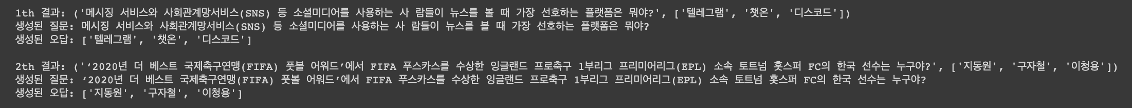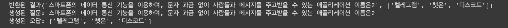print(f"생성된 질문: {results[0]}\n생성된 오답: {results[1]}")