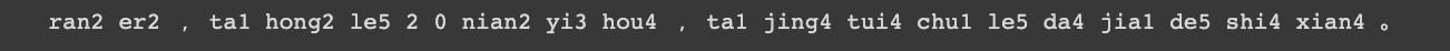 print(g2p_zh("然而,他红了20年以后,他竟退出了大家的视线。"))